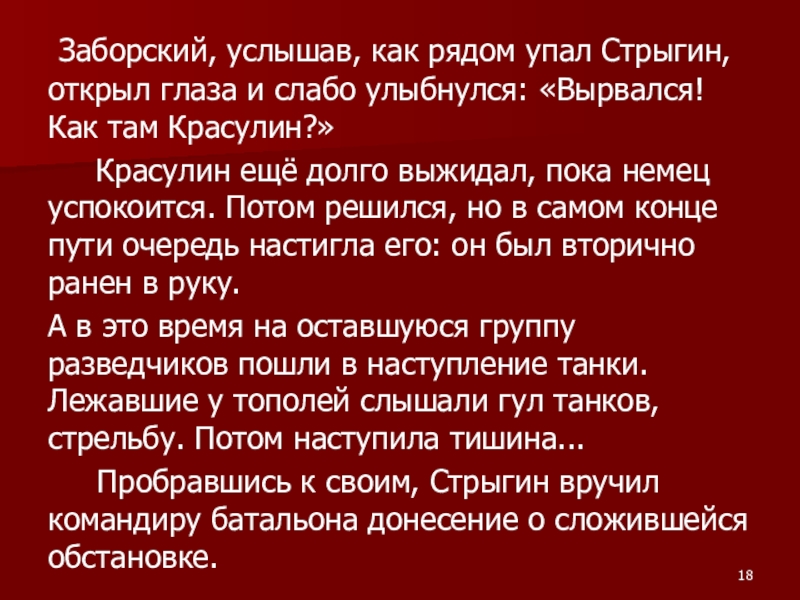 Слайд 18 Заборский, услышав, как рядом упал Стрыгин, открыл глаза и слабо