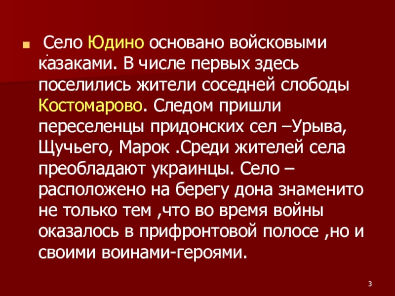 Слайд 3 Село Юдино основано войсковыми казаками. В числе первых здесь поселились