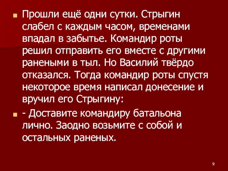 Слайд 9Прошли ещё одни сутки. Стрыгин слабел с каждым часом, временами впадал