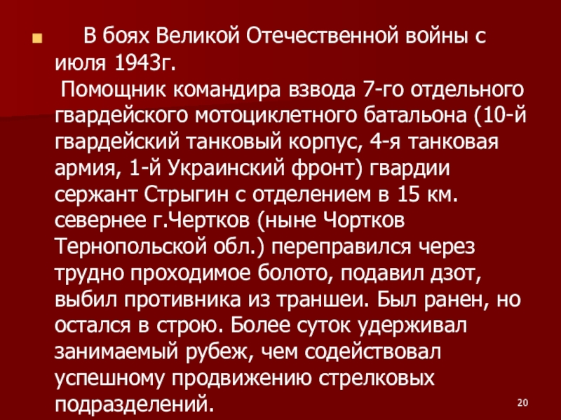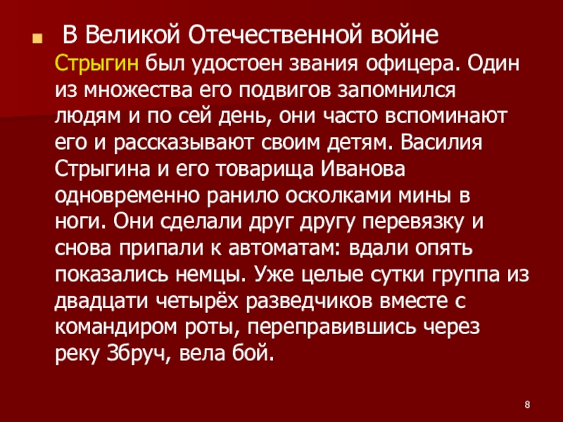 Слайд 8 В Великой Отечественной войне Стрыгин был удостоен звания офицера. Один