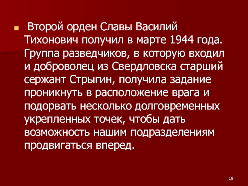 Слайд 19 Второй орден Славы Василий Тихонович получил в марте 1944 года.