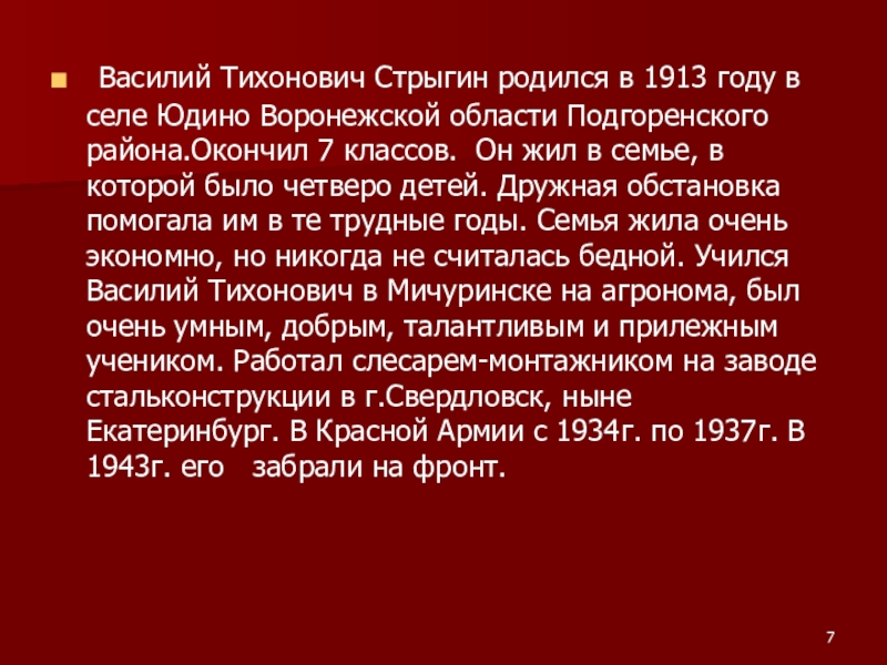Слайд 7 Василий Тихонович Стрыгин родился в 1913 году в селе Юдино