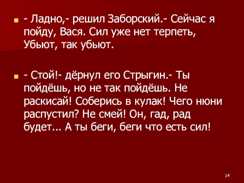 Слайд 14- Ладно,- решил Заборский.- Сейчас я пойду, Вася. Сил уже нет