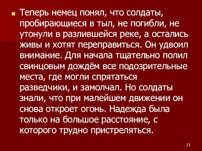 Слайд 13Теперь немец понял, что солдаты, пробирающиеся в тыл, не погибли, не