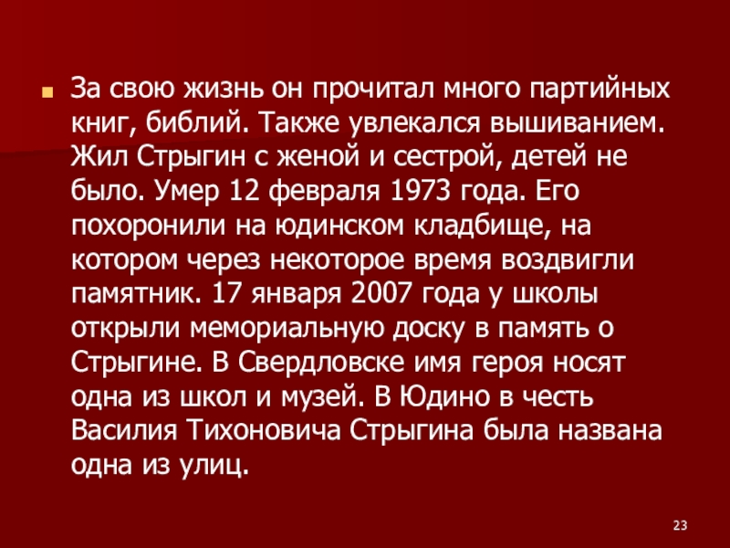вышиванием. Жил Стрыгин с женой и сестрой, детей не было. Умер 12 февраля 1973 года. Его похоронили на юдинском кладбище, на котором через некоторое время воздвигли памятник. 17 января 2007 года у школы открыли мемориальную доску в память о Стрыгине. В Свердловске имя героя носят одна из школ и музей. В Юдино в честь Василия Тихоновича Стрыгина была названа одна из улиц.