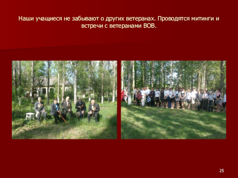 Слайд 25Наши учащиеся не забывают о других ветеранах. Проводятся митинги и встречи
