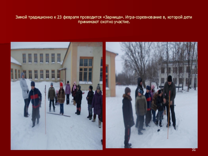 Слайд 31Зимой традиционно к 23 февраля проводится «Зарница». Игра-соревнование в, которой дети