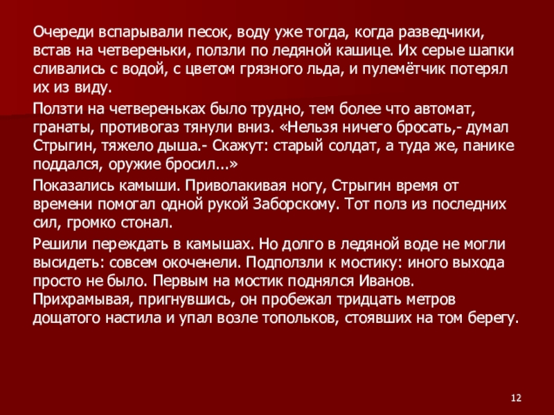 Слайд 12Очереди вспарывали песок, воду уже тогда, когда разведчики, встав на четвереньки,
