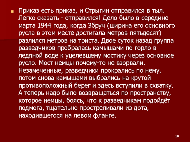 Слайд 10Приказ есть приказ, и Стрыгин отправился в тыл. Легко сказать -