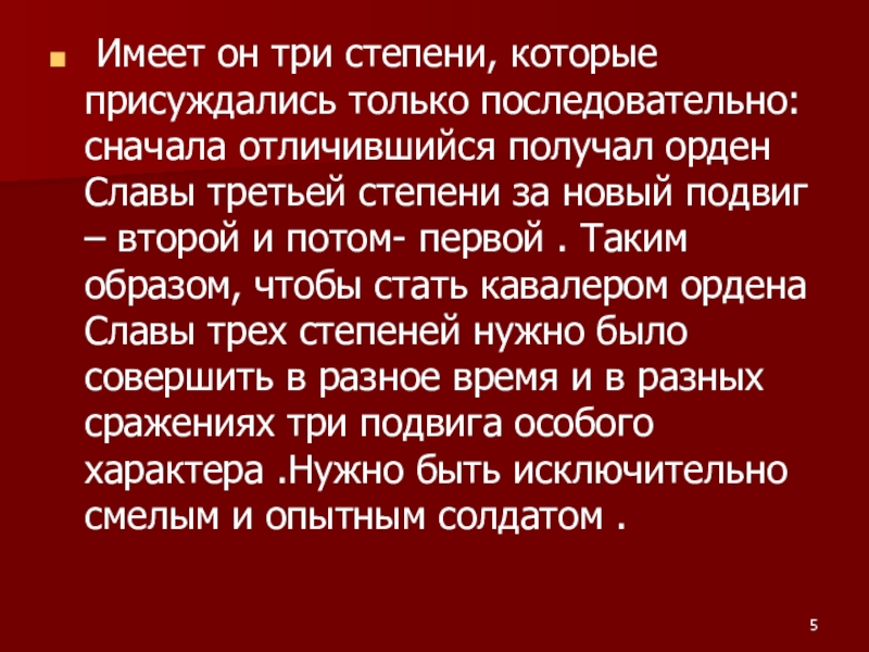 Слайд 5 Имеет он три степени, которые присуждались только последовательно: сначала отличившийся