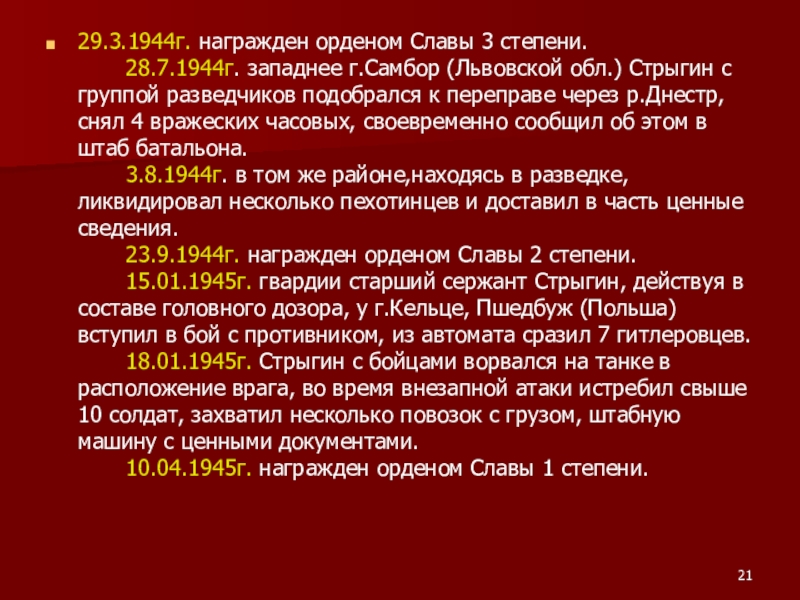 Слайд 2129.3.1944г. награжден орденом Славы 3 степени.