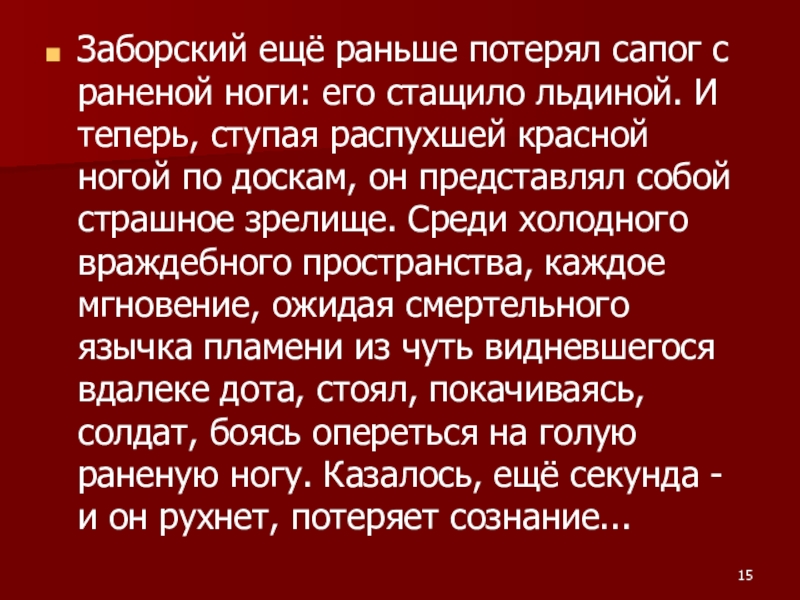 Слайд 15Заборский ещё раньше потерял сапог с раненой ноги: его стащило льдиной.