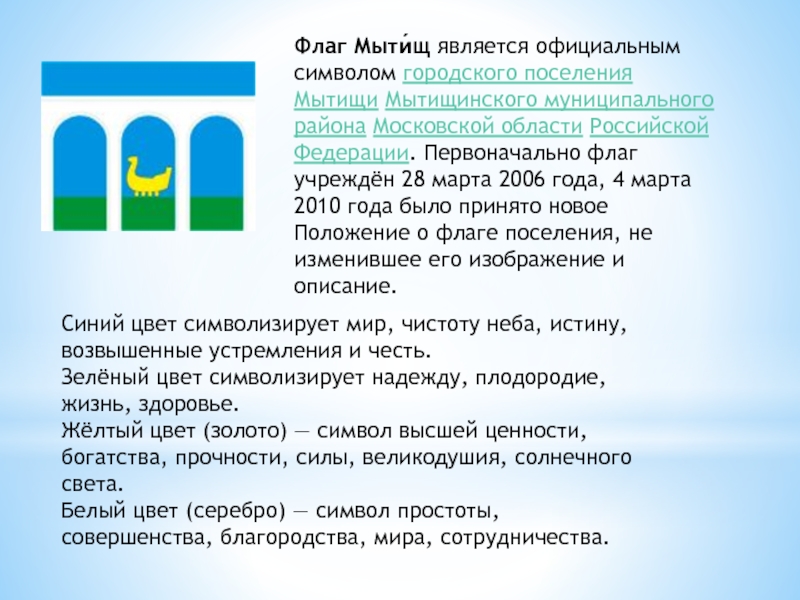 Синий цвет символизирует мир, чистоту неба, истину, возвышенные устремления и честь.