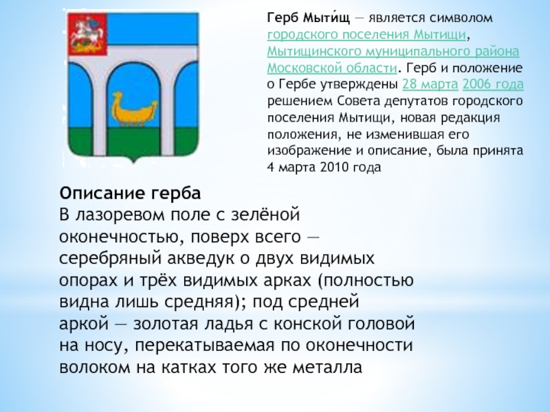 В лазоревом поле с зелёной оконечностью, поверх всего — серебряный акведук о двух видимых опорах и трёх видимых арках (полностью видна лишь средняя); под средней аркой — золотая ладья с конской головой на носу, перекатываемая по оконечности волоком на катках того же металла