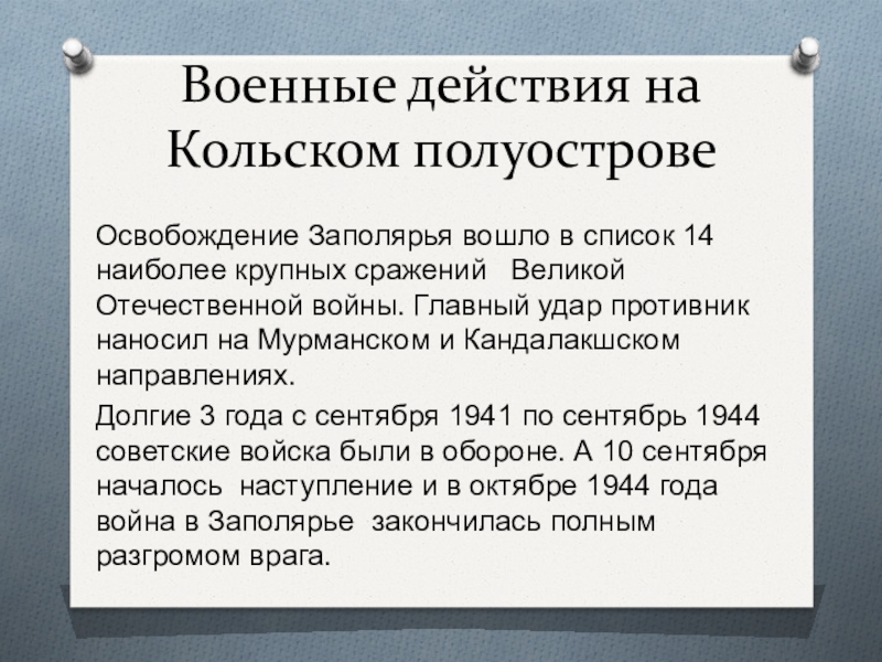 крупных сражений Великой Отечественной войны. Главный удар противник наносил на Мурманском и Кандалакшском направлениях.