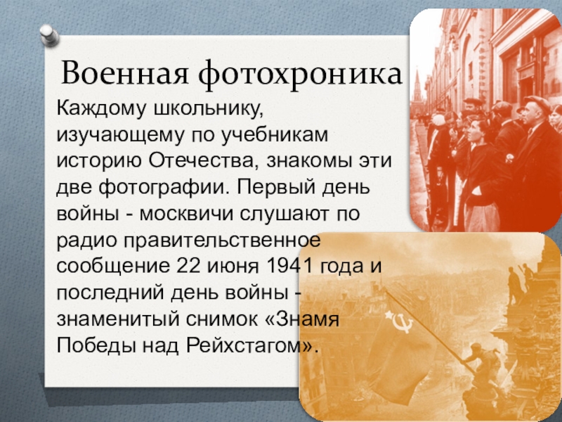 фотографии. Первый день войны - москвичи слушают по радио правительственное сообщение 22 июня 1941 года и последний день войны - знаменитый снимок «Знамя Победы над Рейхстагом».
