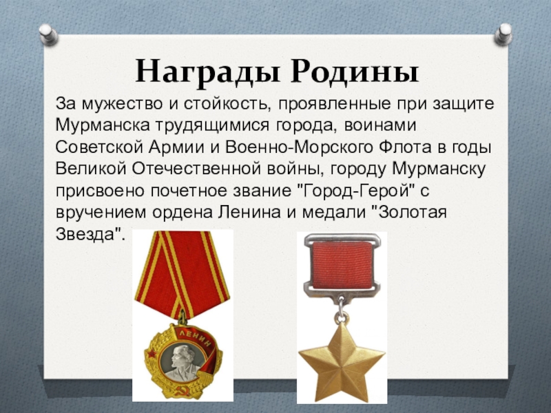 воинами Советской Армии и Военно-Морского Флота в годы Великой Отечественной войны, городу Мурманску присвоено почетное звание "Город-Герой" с вручением ордена Ленина и медали "Золотая Звезда".