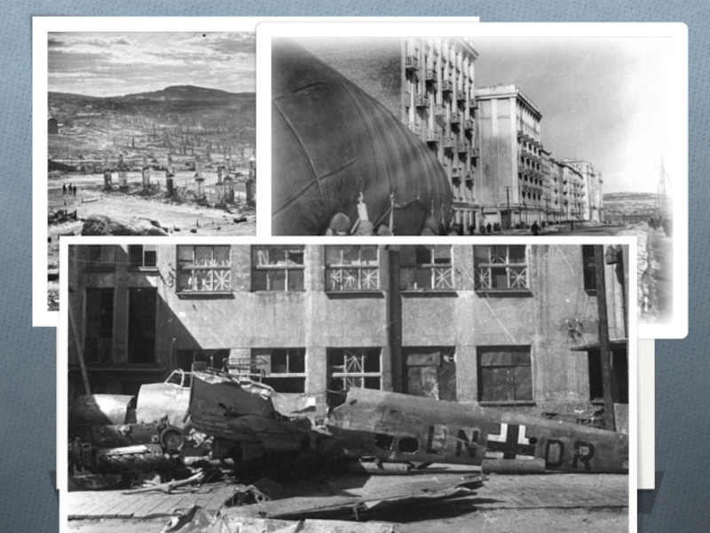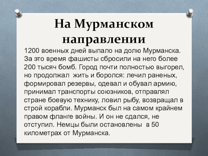 время фашисты сбросили на него более 200 тысяч бомб. Город почти полностью выгорел, но продолжал жить и боролся: лечил раненых, формировал резервы, одевал и обувал армию, принимал транспорты союзников, отправлял стране боевую технику, ловил рыбу, возвращал в строй корабли. Мурманск был на самом крайнем правом фланге войны. И он не сдался, не отступил. Немцы были остановлены в 50 километрах от Мурманска.