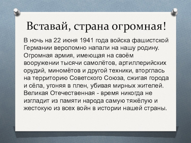Германии вероломно напали на нашу родину. Огромная армия, имеющая на своём вооружении тысячи самолётов, артиллерийских орудий, миномётов и другой техники, вторглась на территорию Советского Союза, сжигая города и сёла, угоняя в плен, убивая мирных жителей. Великая Отечественная - время никогда не изгладит из памяти народа самую тяжёлую и жестокую из всех войн в истории нашей страны.