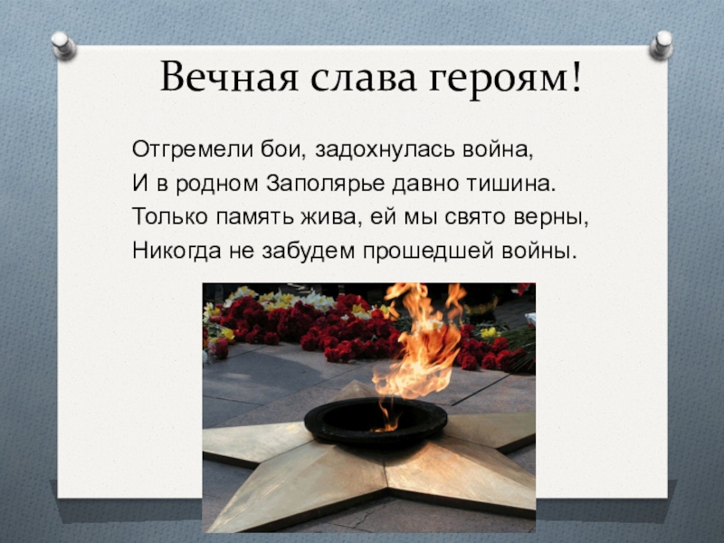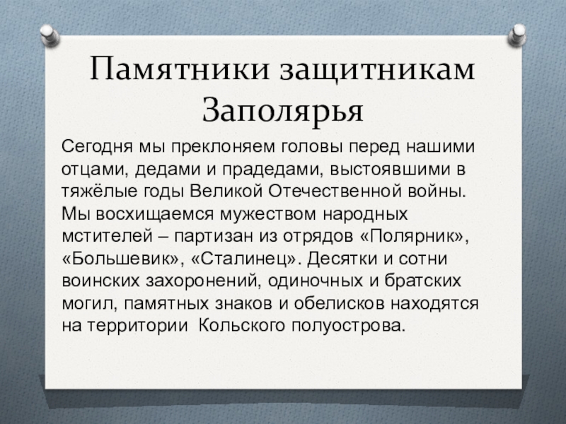 прадедами, выстоявшими в тяжёлые годы Великой Отечественной войны. Мы восхищаемся мужеством народных мстителей – партизан из отрядов «Полярник», «Большевик», «Сталинец». Десятки и сотни воинских захоронений, одиночных и братских могил, памятных знаков и обелисков находятся на территории Кольского полуострова.