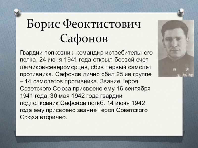 открыл боевой счет летчиков-североморцев, сбив первый самолет противника. Сафонов лично сбил 25 ив группе – 14 самолетов противника. Звание Героя Советского Союза присвоено ему 16 сентября 1941 года. 30 мая 1942 года гвардии подполковник Сафонов погиб. 14 июня 1942 года ему присвоено звание Героя Советского Союза вторично.