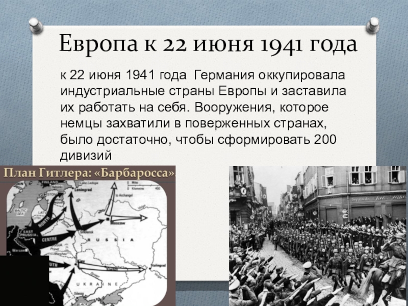 оккупировала индустриальные страны Европы и заставила их работать на себя. Вооружения, которое немцы захватили в поверженных странах, было достаточно, чтобы сформировать 200 дивизий