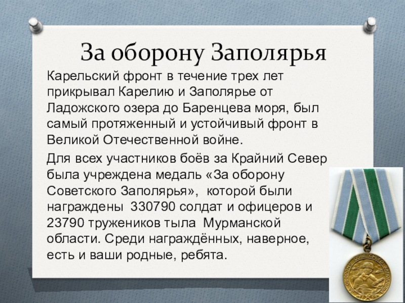 Для всех участников боёв за Крайний Север была учреждена медаль «За оборону Советского Заполярья», которой были награждены 330790 солдат и офицеров и 23790 тружеников тыла Мурманской области. Среди награждённых, наверное, есть и ваши родные, ребята.