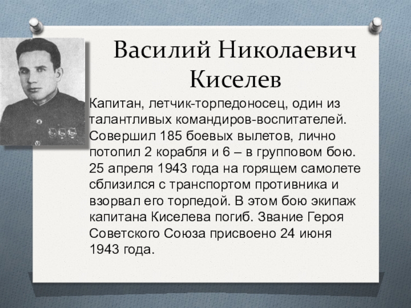 Капитан, летчик-торпедоносец, один из талантливых командиров-воспитателей. Совершил 185 боевых