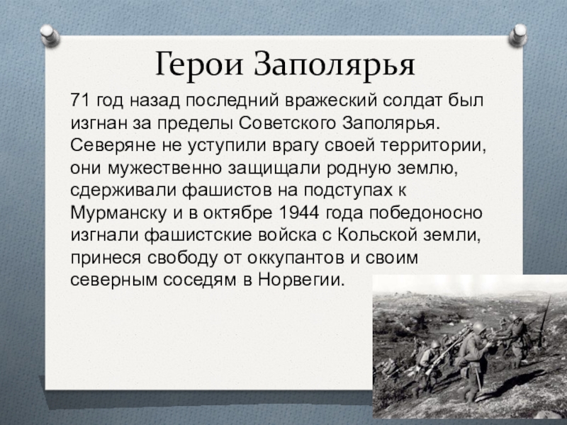 Советского Заполярья. Северяне не уступили врагу своей территории, они мужественно защищали родную землю, сдерживали фашистов на подступах к Мурманску и в октябре 1944 года победоносно изгнали фашистские войска с Кольской земли, принеся свободу от оккупантов и своим северным соседям в Норвегии.
