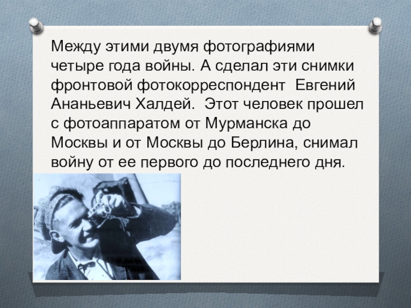 Слайд 19Между этими двумя фотографиями четыре года войны. А сделал эти снимки