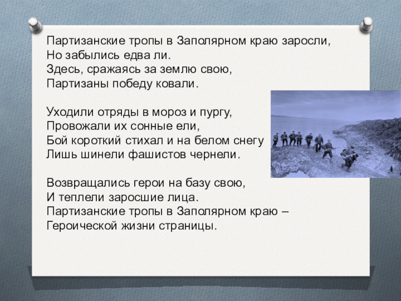Слайд 21Партизанские тропы в Заполярном краю заросли,