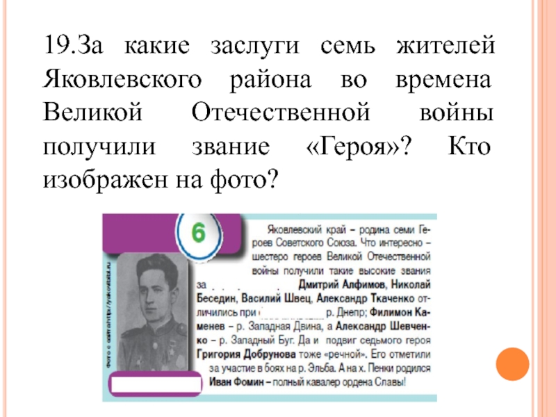 19.За какие заслуги семь жителей Яковлевского района во времена Великой Отечественной войны получили звание «Героя»? Кто изображен