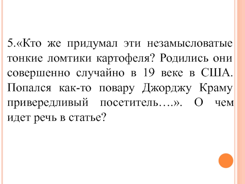 5.«Кто же придумал эти незамысловатые тонкие ломтики картофеля? Родились они совершенно случайно в 19 веке в США.