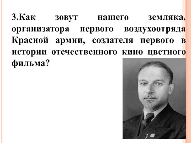 3.Как зовут нашего земляка, организатора первого воздухоотряда Красной армии, создателя первого в истории отечественного кино цветного фильма?
