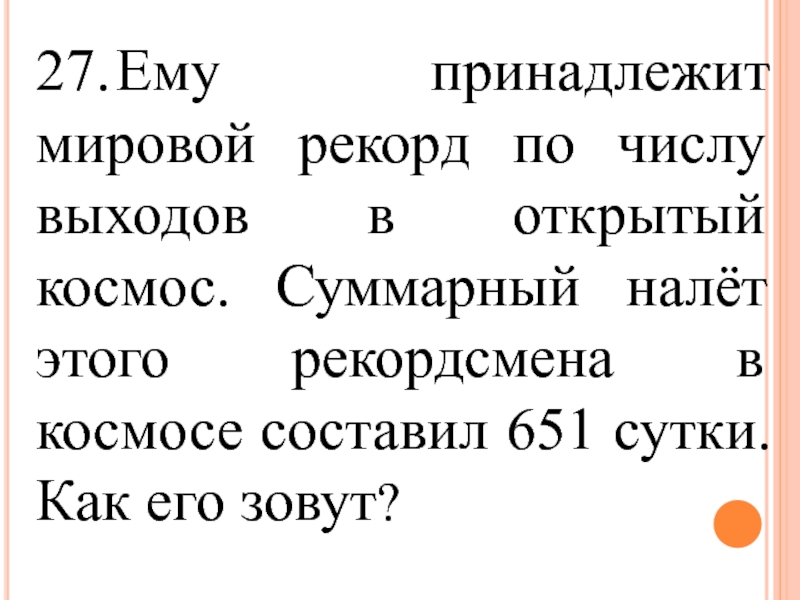 27.	Ему принадлежит мировой рекорд по числу выходов в открытый космос. Суммарный налёт этого рекордсмена в космосе составил