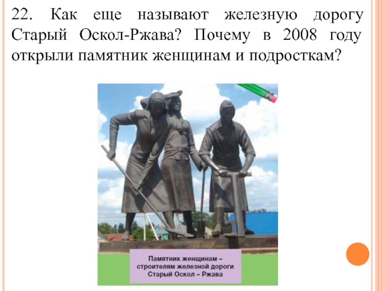 22.	Как еще называют железную дорогу Старый Оскол-Ржава? Почему в 2008 году открыли памятник женщинам и подросткам?