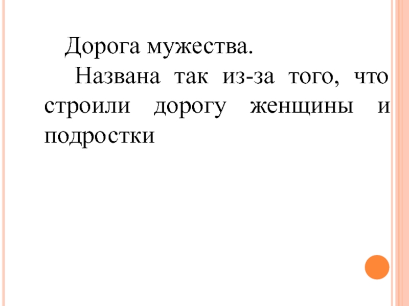 Дорога мужества.	 Названа так из-за того, что строили дорогу женщины и подростки