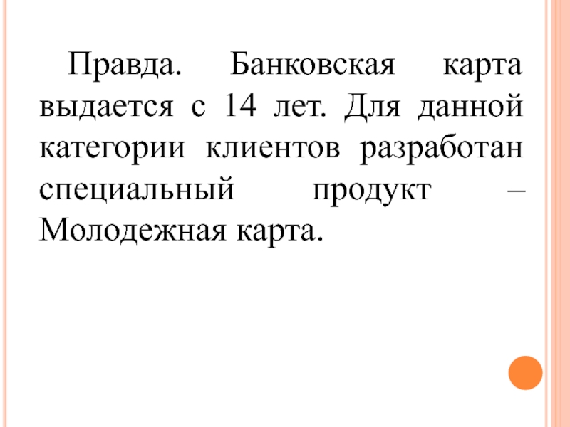 Слайд 17 Правда. Банковская карта выдается с 14 лет. Для данной категории клиентов