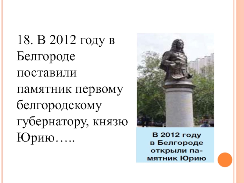 18. В 2012 году в Белгороде поставили памятник первому белгородскому губернатору, князю Юрию…..