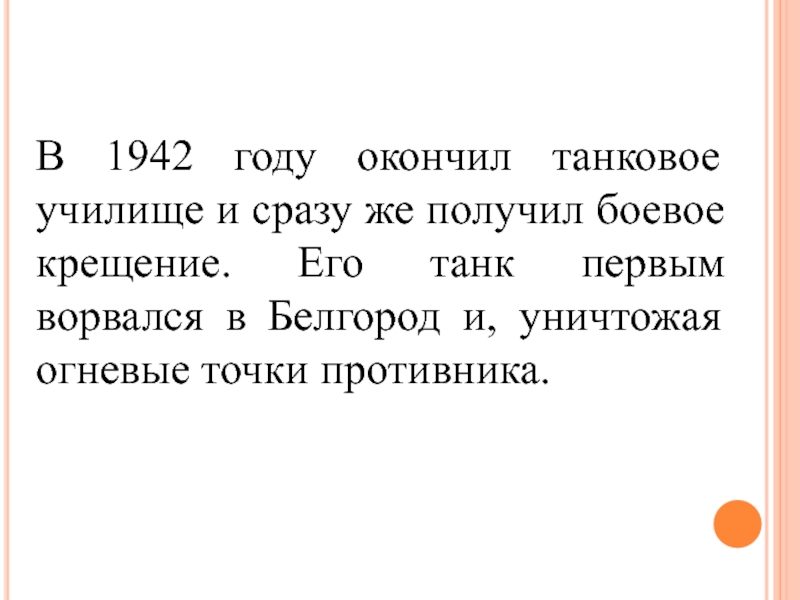 Слайд 39В 1942 году окончил танковое училище и сразу же получил боевое