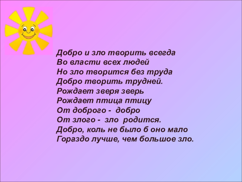 Добро и зло творить всегдаВо власти всех людейНо зло творится без трудаДобро творить трудней.Рождает зверя зверьРождает птица
