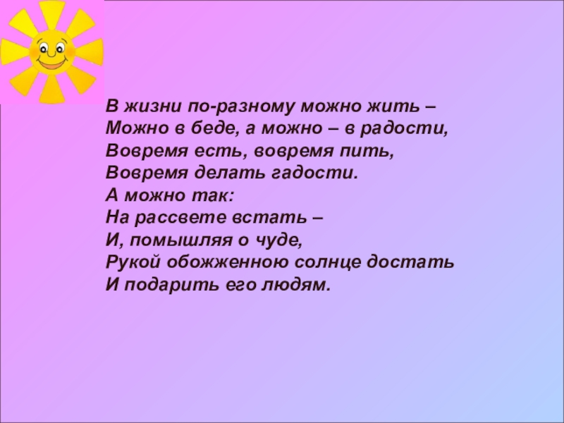 В жизни по-разному можно жить – Можно в беде, а можно – в радости,Вовремя есть, вовремя пить,Вовремя делать гадости.А можно так:На рассвете встать – И, помышляя о чуде,Рукой обожженною солнце достатьИ подарить его людям.
