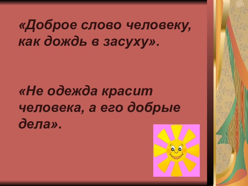 Слайд 10«Доброе слово человеку, как дождь в засуху». «Не одежда красит человека, а