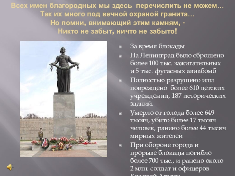Умерло от голода более 649 тысяч, убито более 17 тысяч человек, ранено более 44 тысяч мирных жителей