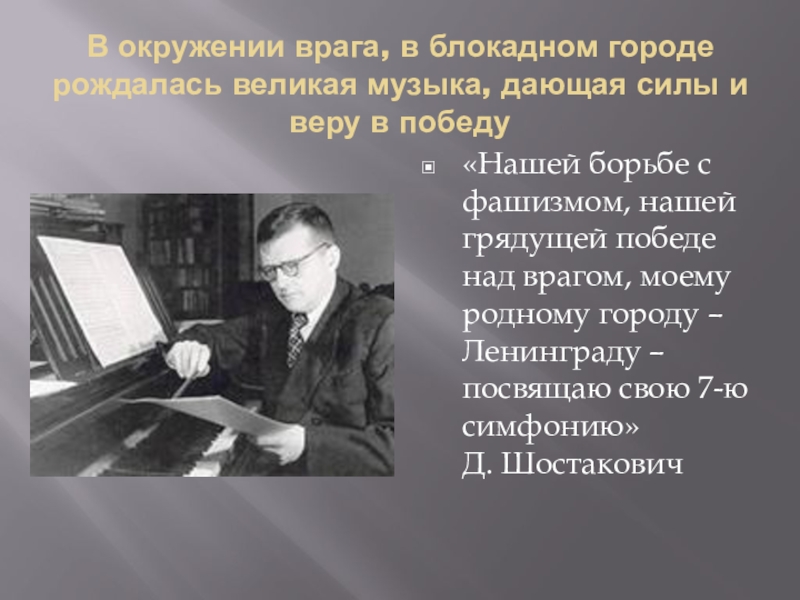 «Нашей борьбе с фашизмом, нашей грядущей победе над врагом, моему родному городу – Ленинграду – посвящаю свою 7-ю симфонию»