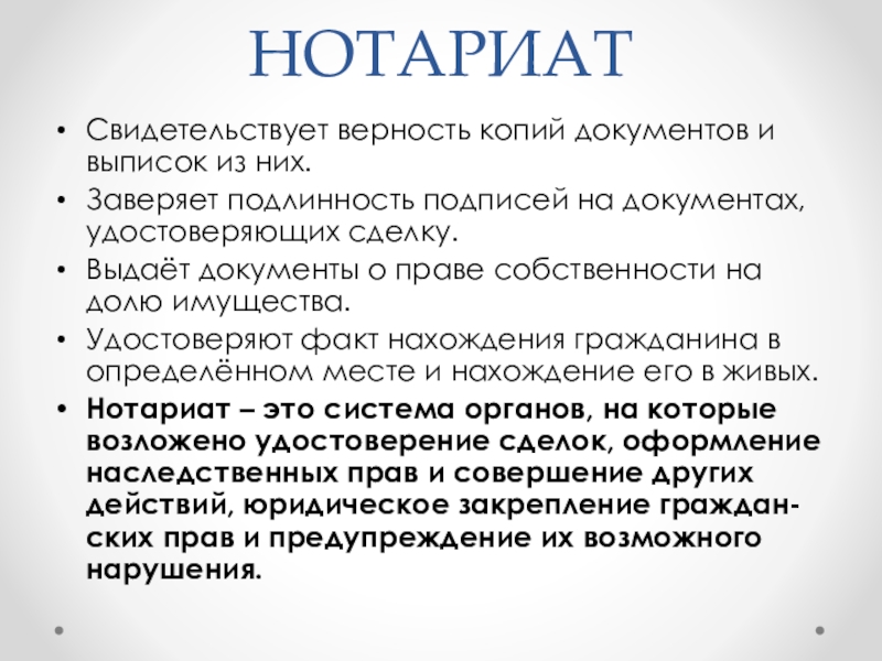 Нотариат – это система органов, на которые возложено удостоверение сделок, оформление наследственных прав и совершение других действий, юридическое закрепление граждан-ских прав и предупреждение их возможного нарушения.