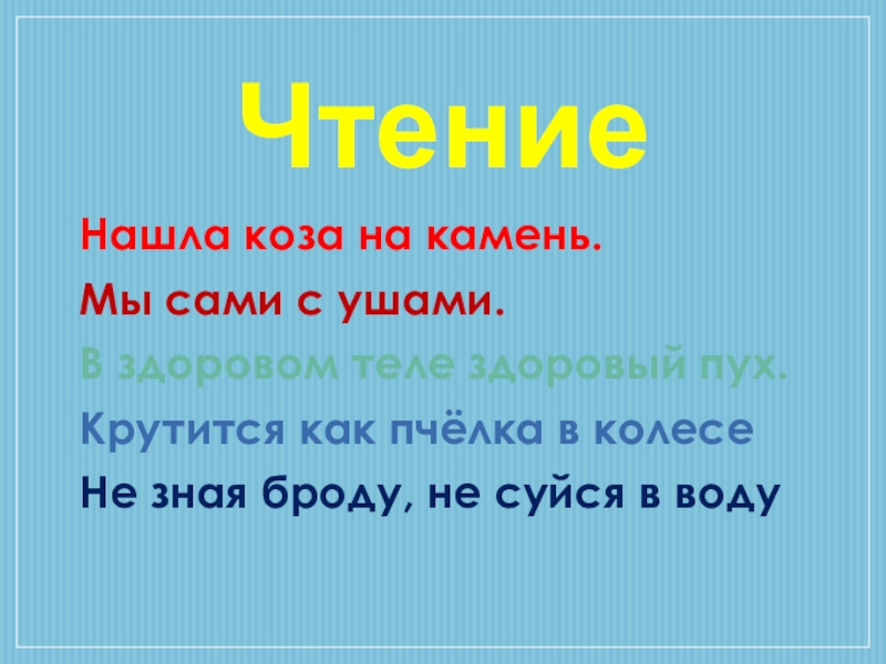 ЧтениеНашла коза на камень.Мы сами с ушами.В здоровом теле здоровый пух.Крутится как пчёлка в колесеНе зная броду,