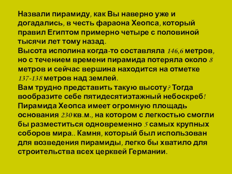 Пирамида Хеопса имеет огромную площадь основания 230 кв.м., на котором с легкостью смогли бы разместиться одновременно 5 самых крупных соборов мира.. Камня, который был использован для возведения пирамиды, легко бы хватило для строительства всех церквей Германии.