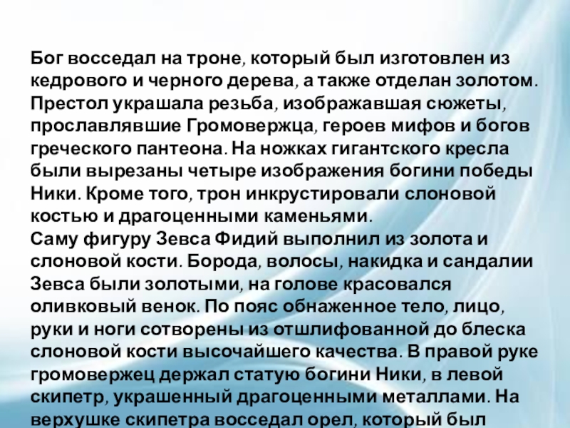 дерева, а также отделан золотом. Престол украшала резьба, изображавшая сюжеты, прославлявшие Громовержца, героев мифов и богов греческого пантеона. На ножках гигантского кресла были вырезаны четыре изображения богини победы Ники. Кроме того, трон инкрустировали слоновой костью и драгоценными каменьями.