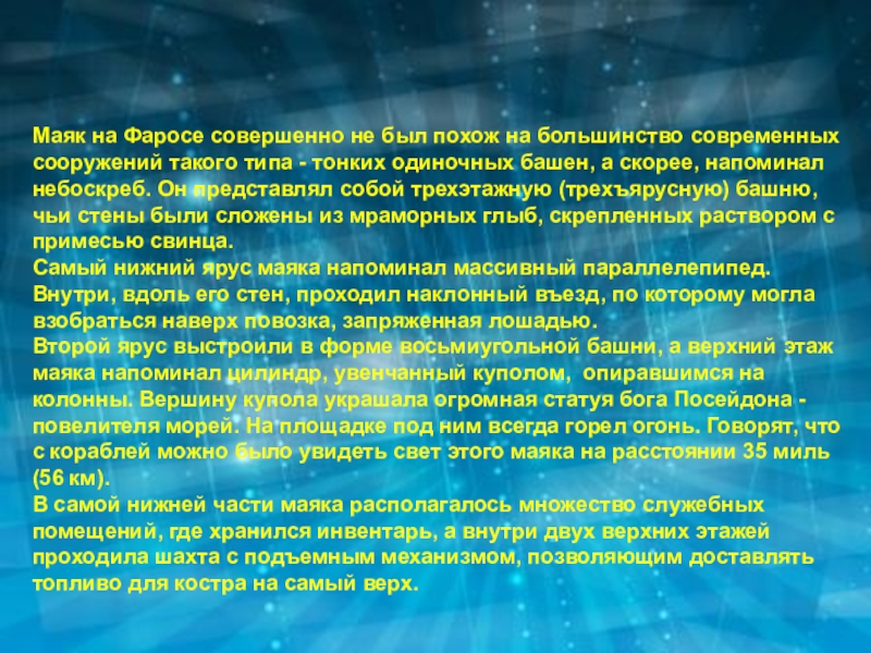 Второй ярус выстроили в форме восьмиугольной башни, а верхний этаж маяка напоминал цилиндр, увенчанный куполом, опиравшимся на колонны. Вершину купола украшала огромная статуя бога Посейдона - повелителя морей. На площадке под ним всегда горел огонь. Говорят, что с кораблей можно было увидеть свет этого маяка на расстоянии 35 миль (56 км).